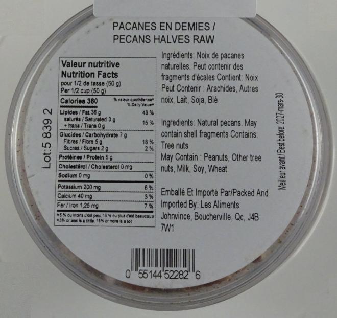 | Les Aliments Johnvince | Pecans Halves Raw | 230 g | 0 55144 52282 6 | Lot: 5 839 2; Best before: "2027-mars-30" |