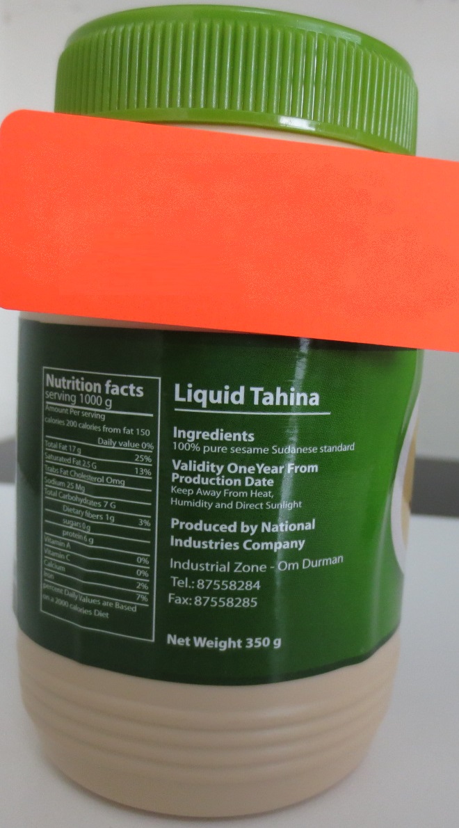 | Alwatania (Arabic characters only) | Liquid Tahina | 350 g | 6 224007 246221 | PRO: 20/05/2019 Best Before 19/05/2021 |