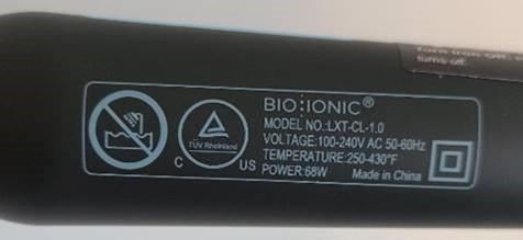 This recall involves the Bio Ionic One Inch Long Barrel Curling Iron model number LXT-CL-1.0 with a date code between 0722 and 1223. The curling iron has a black handle and a black barrel. The product measures approximately 40 cm (15.8 inches) long by 7 cm (2.8 inches) high by 4 cm (1.6 inches) wide and weighs approximately 425 grams (15 ounces). The curling iron handle has a blue BIOIONIC logo and a black label that provides operating instructions. The model number can be found on the rating label located on the handle of the curling iron. The date code is engraved on the prongs of the plug in the format MMYY representing the month and year.