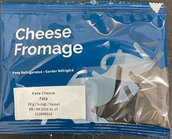 | None | Cheese - Feta Cheese | 56 g (1/2 cup) | None | 571607809 BB 2026 AL 02; 551606507 BB 2026 AL 17; 152606511 BB 2026 AL 17; 152606512 BB 2026 AL 17; 152608008 BB 2026 AL 19* |