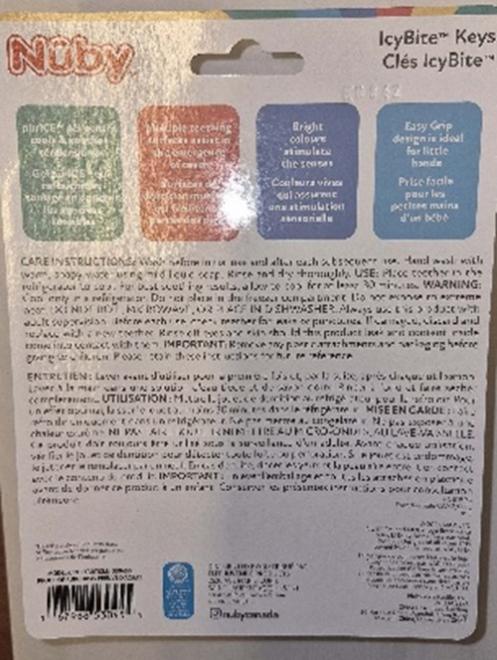 This recall involves a batch of Nûby IcyBiteTM Keys teethers. The recalled teethers can be identified by item number 530455, UPC 067988 53045 5, and embossed lot number ED04Z, which are printed on the back of the packaging. The lot number is also located on the ring of the teething toy.