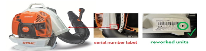 This recall involves STIHL BR800 Backpack Blowers. Any inspected or reworked units will have a black dot adjacent to the serial number. Units bearing this mark are safe to continue operating and do not need to be returned to the STIHL Dealer.