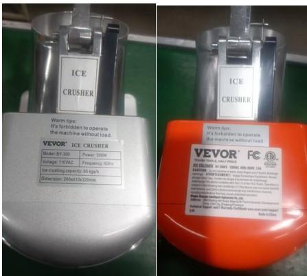 This recall involves Vevor Ice Crusher machines. The products were advertised as Ice Shavers, Ice Crushers, and Snow Cone Makers. The ice crushing machines were all sold under model number BY-300 and BY-300 FS and came in yellow, red, silver, and blue. "Vevor" is printed on a label located on the side of the product and the model number is printed on a label on the top of the product.