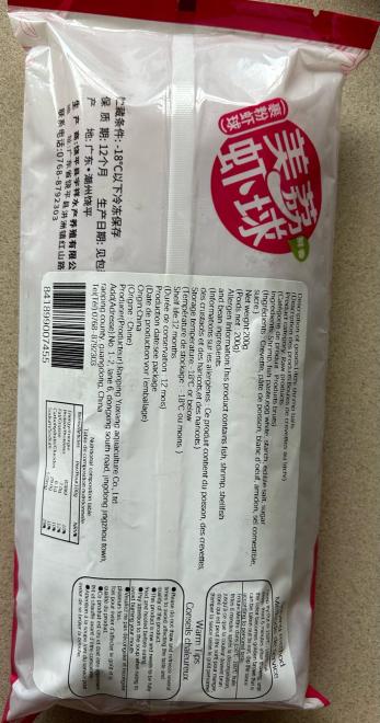 | Yuxiang Aquatic | Shrimp Balls | 200 g | 841899007431 | 2022/12/21 | Egg, Gluten*, Milk, Soy |