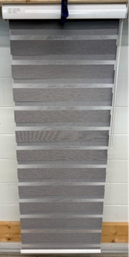 This recall involves the Zebra Blind by B&B Blinds. The blinds have a striped pattern in grey/beige tones and are equipped with a cord that operates to lift/lower the blinds.