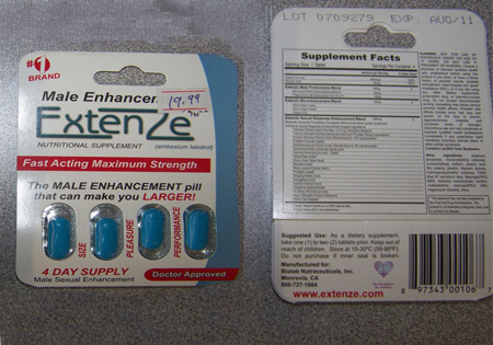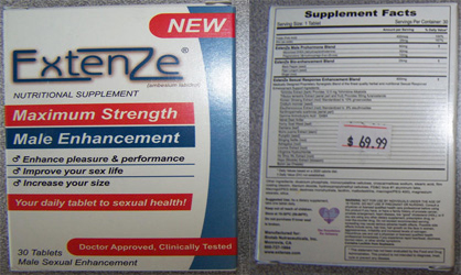 Santé Canada a saisi les compléments non homologués « Male Enhancement ExtenZe » et « Women ExtenZe », importés et vendus par le magasin pour adultes Happy Paradise, à Burnaby, en Colombie-Britannique. L'étiquette indique que ces produits contiennent des ingrédients les obligeant légalement à être vendus sur ordonnance, car ils peuvent présenter des effets secondaires nécessitant la supervision d'un professionnel de la santé.