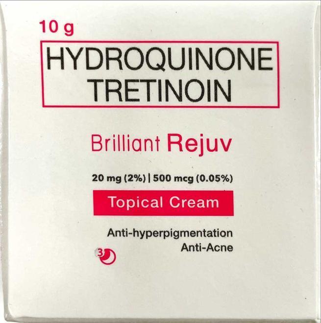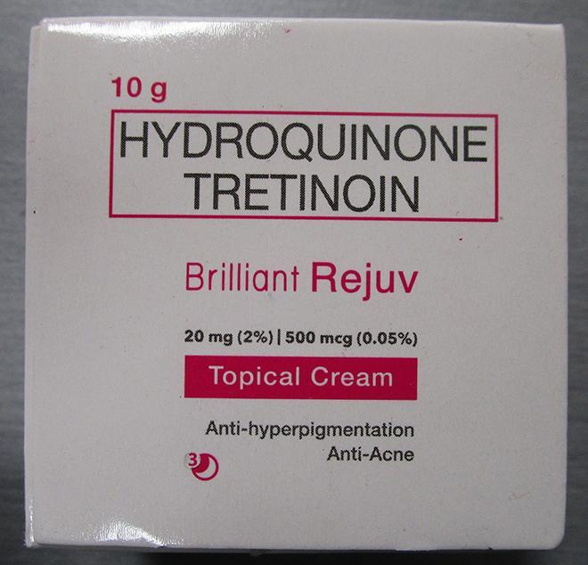 L'étiquette indique la présence de trétinoïne et d'hydroquinone |