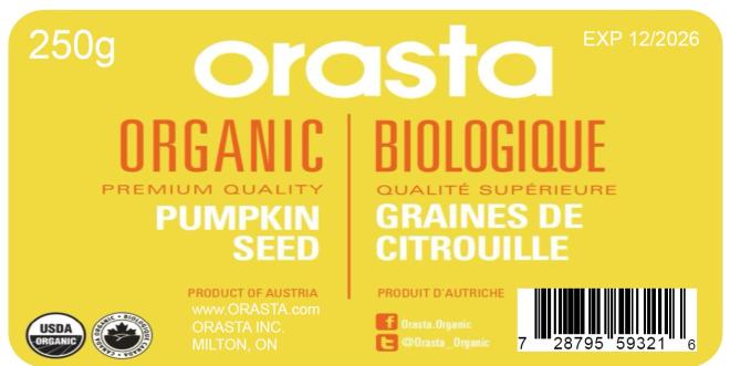 | Orasta | Biologique - Graines de citrouille | 250 g | 7 28795 59321 6 | Vendu du 17 avril 2025 au 10 mai 2025 | Vendu chez Fiesta Farm, 200 Christie St., Toronto, ON |