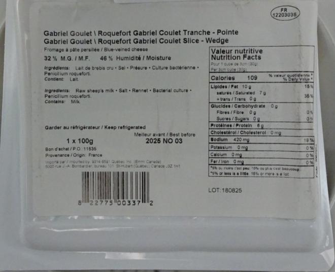 Maison Gabriel Coulet | Roquefort La Cave - Tranche - Pointe | 100 g | 8 22775 00337 2 | Lot : 180825 Meilleur avant : 2025 NO 03 |