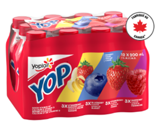 | Yoplait | Yogourt à boire YOP saveur de fraise-banane, saveur de bleuet, saveur de fraise et saveur de framboise | 12 x 200 mL | 0 56920 13034 1 | Toutes les dates Meilleur avant jusqu'au 03JAN6AY, inclusivement |